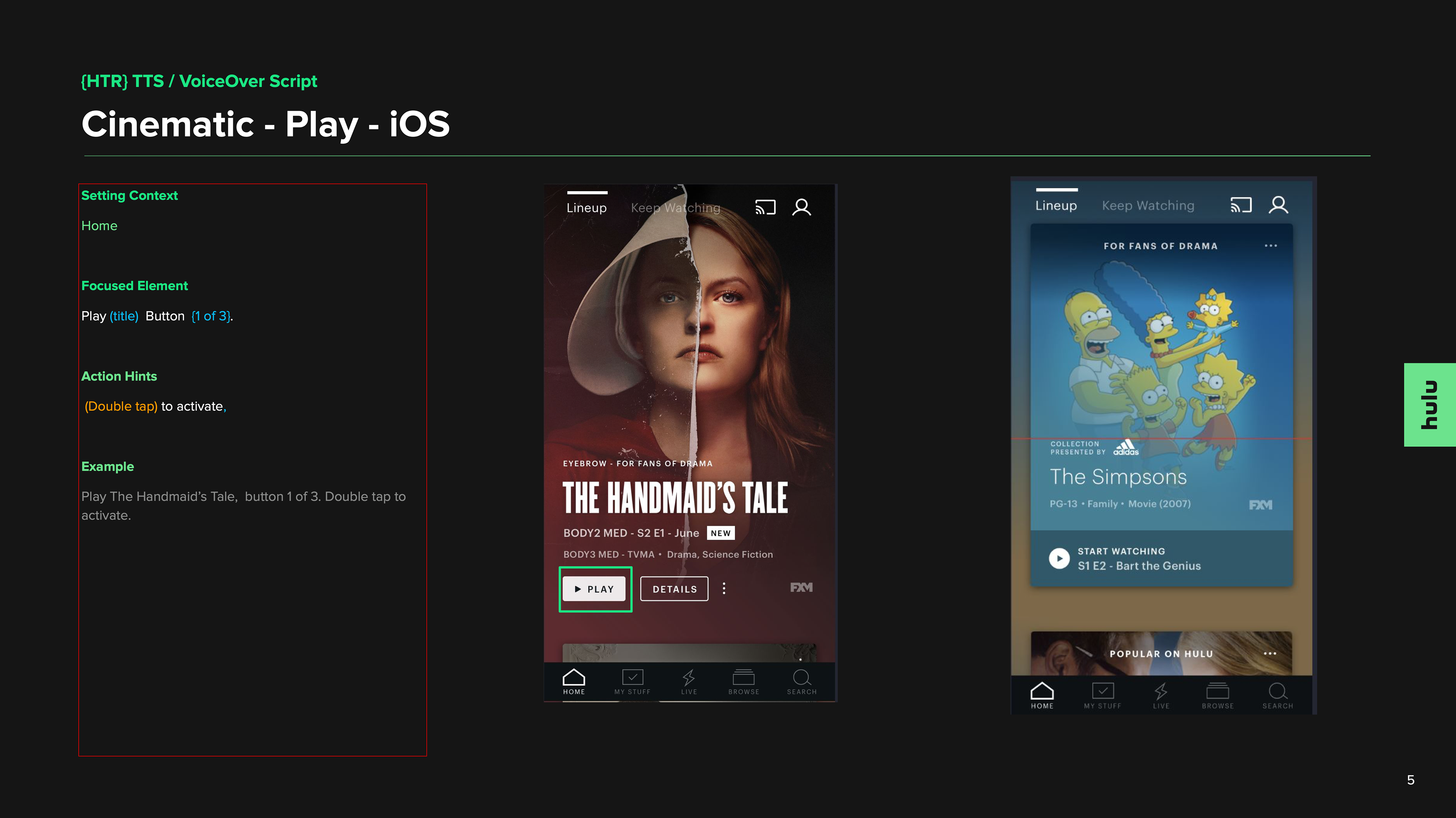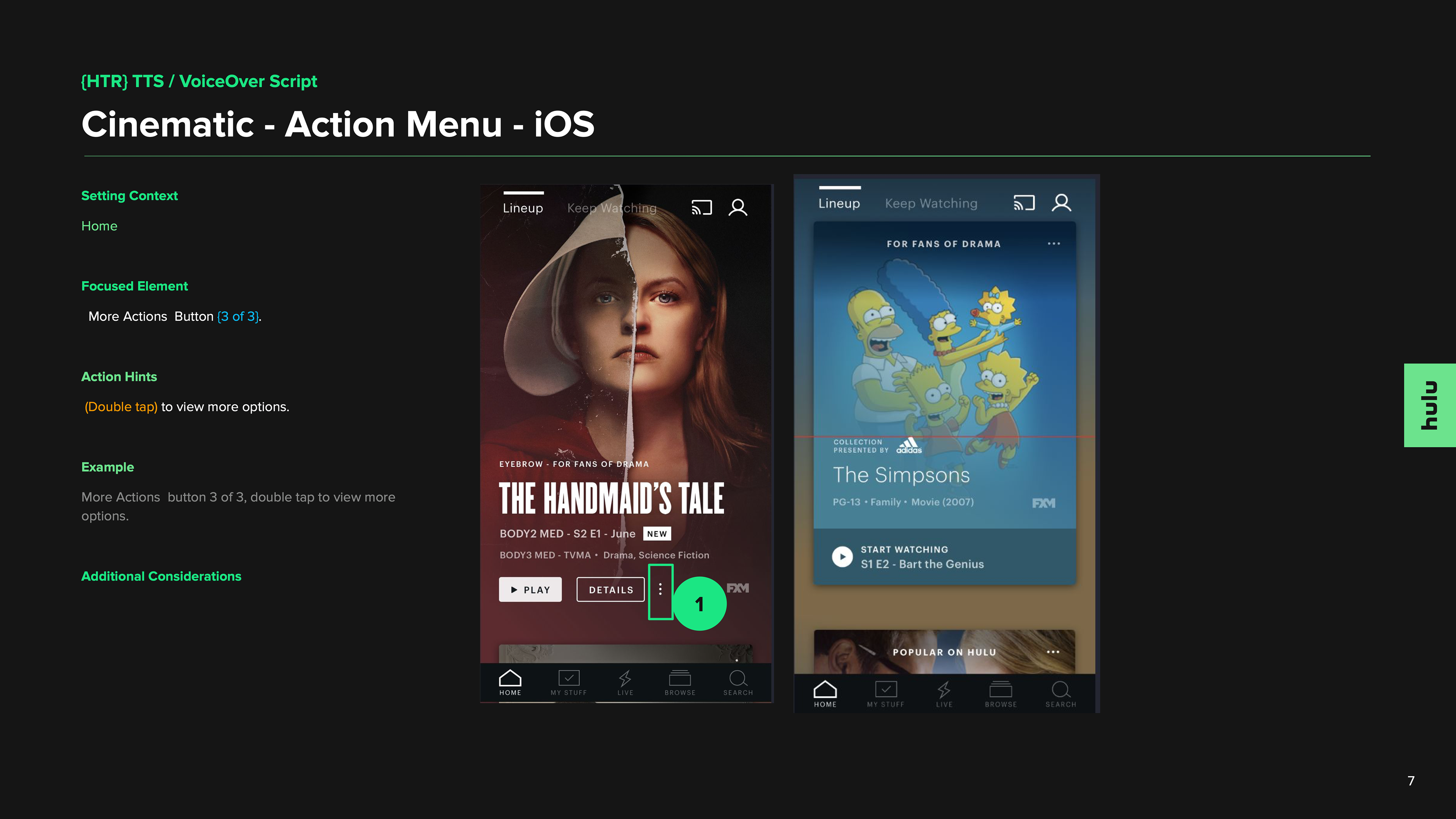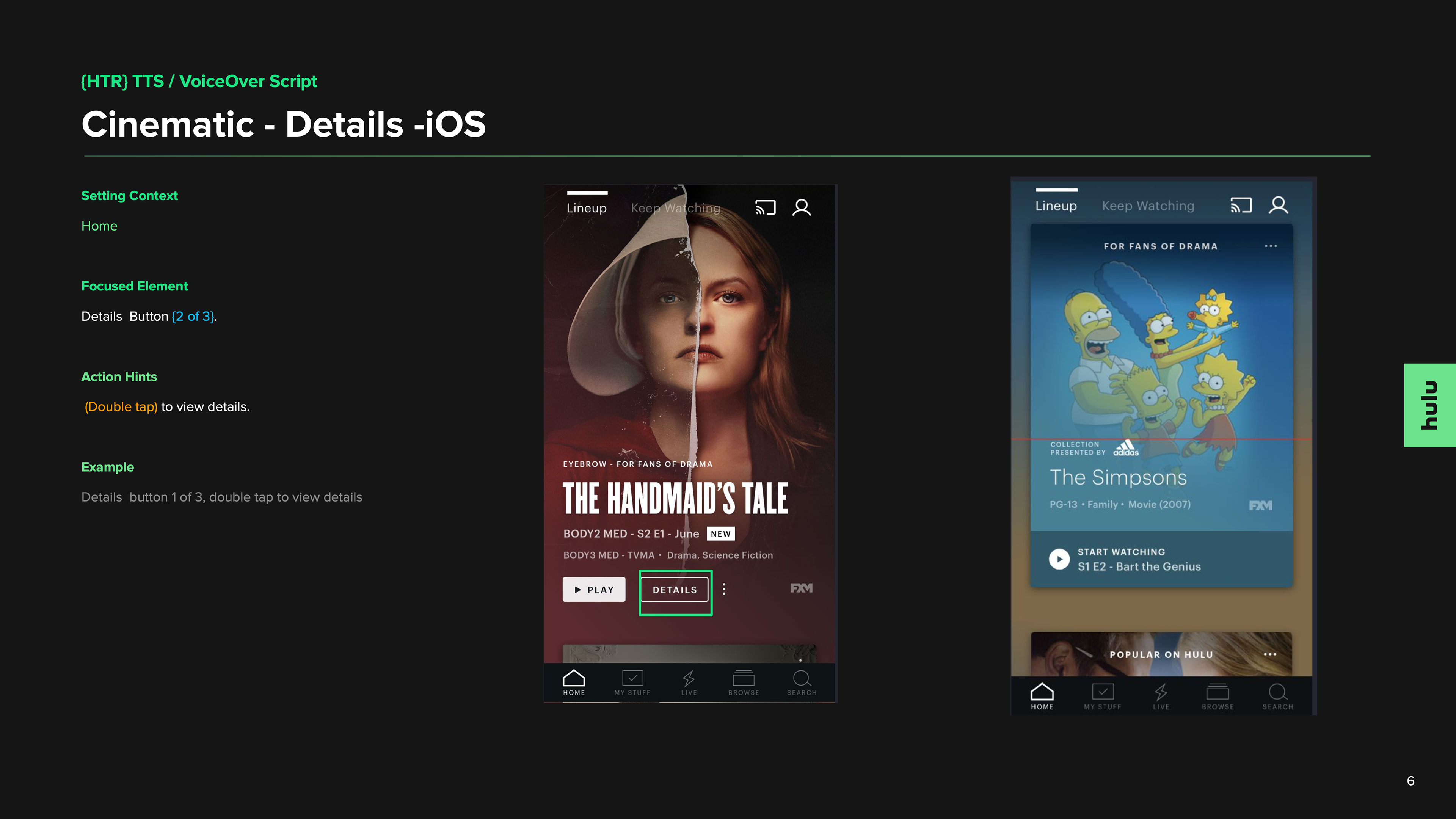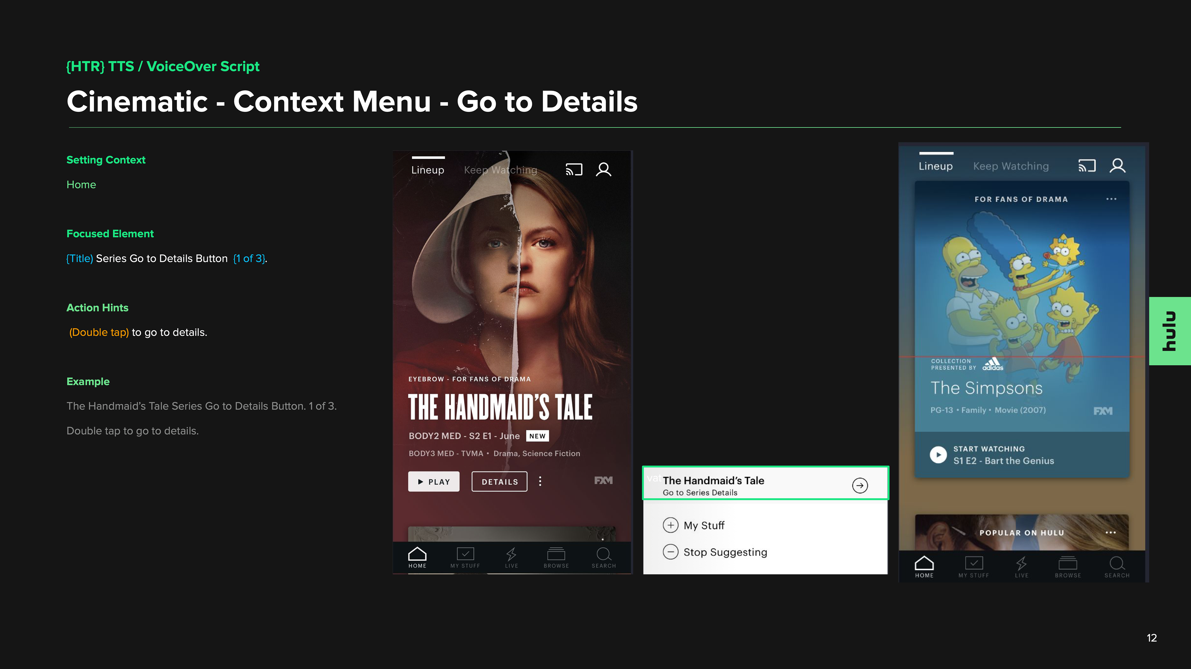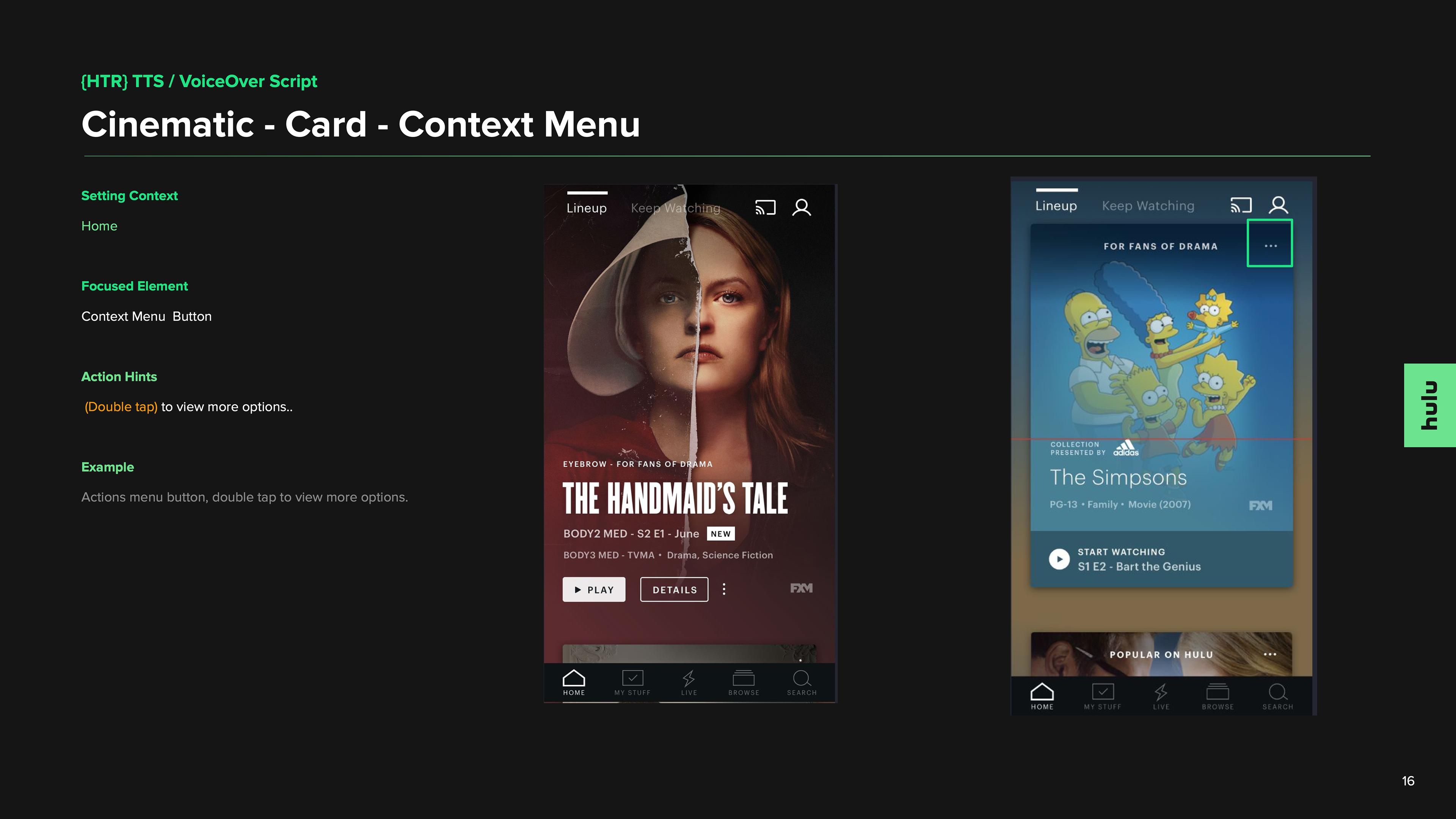 This work was completed in collaboration with the mobile development team. The focus was to create an experience tailored to users who use screen readers to navigate the Hulu app.