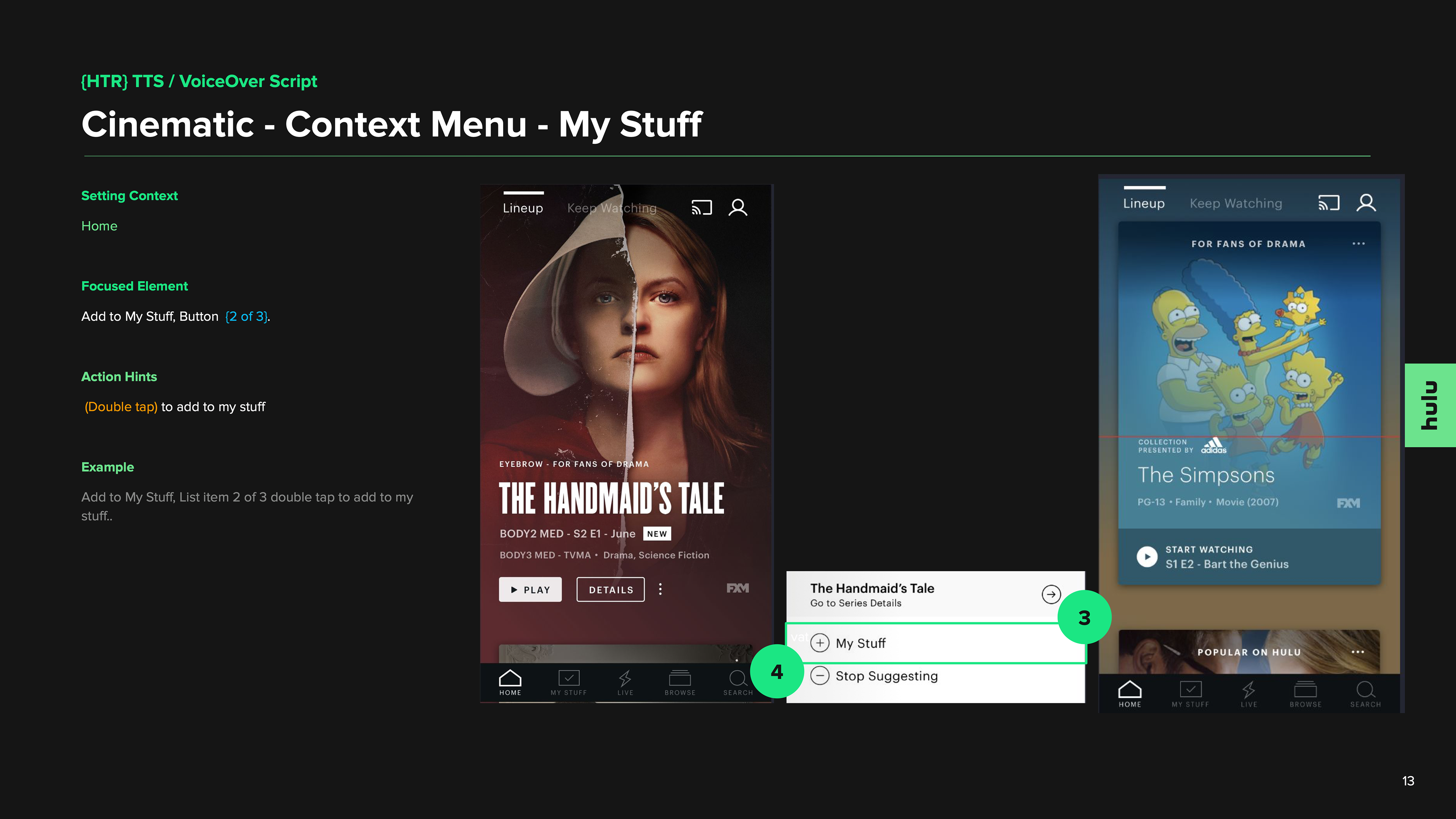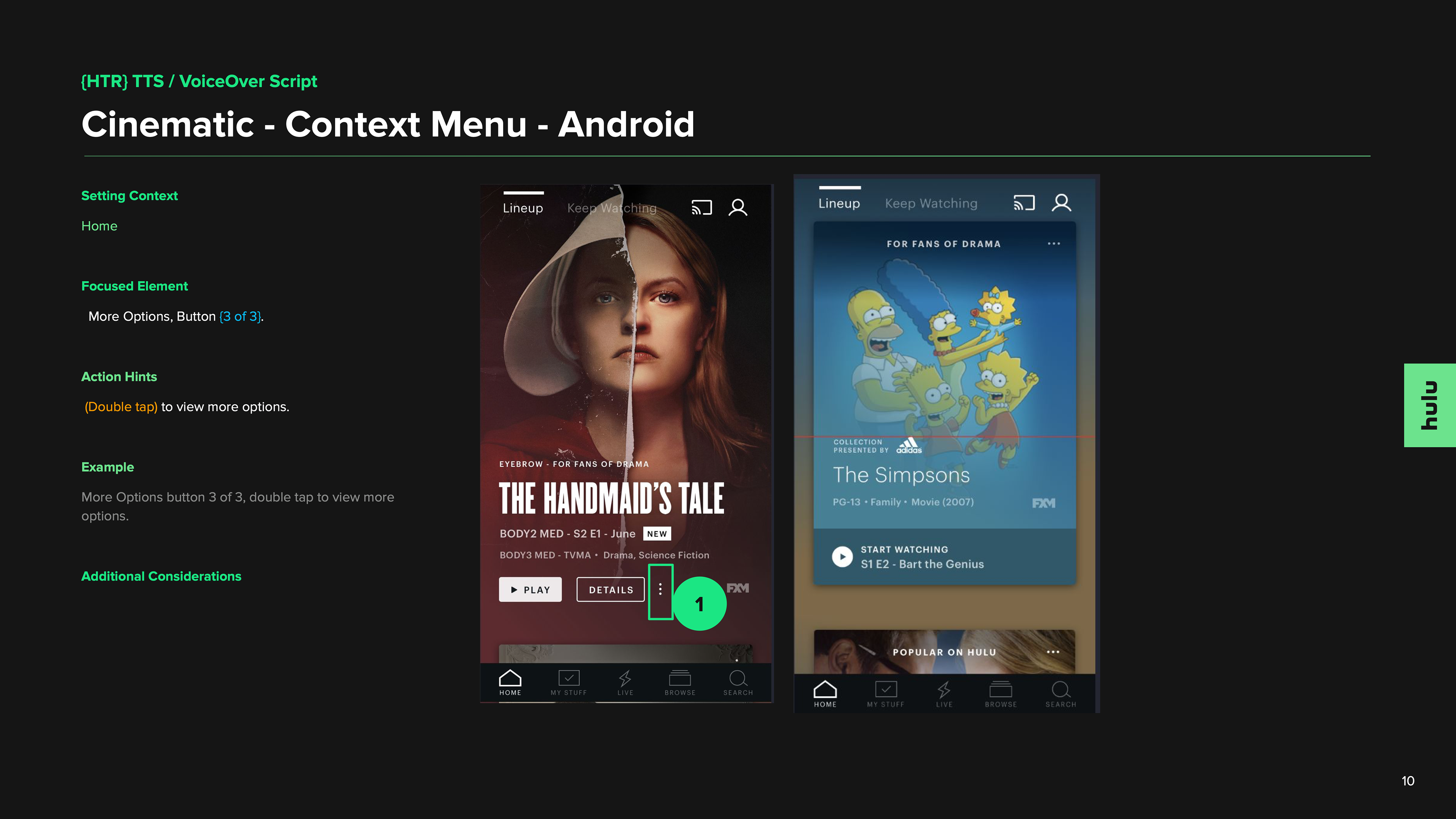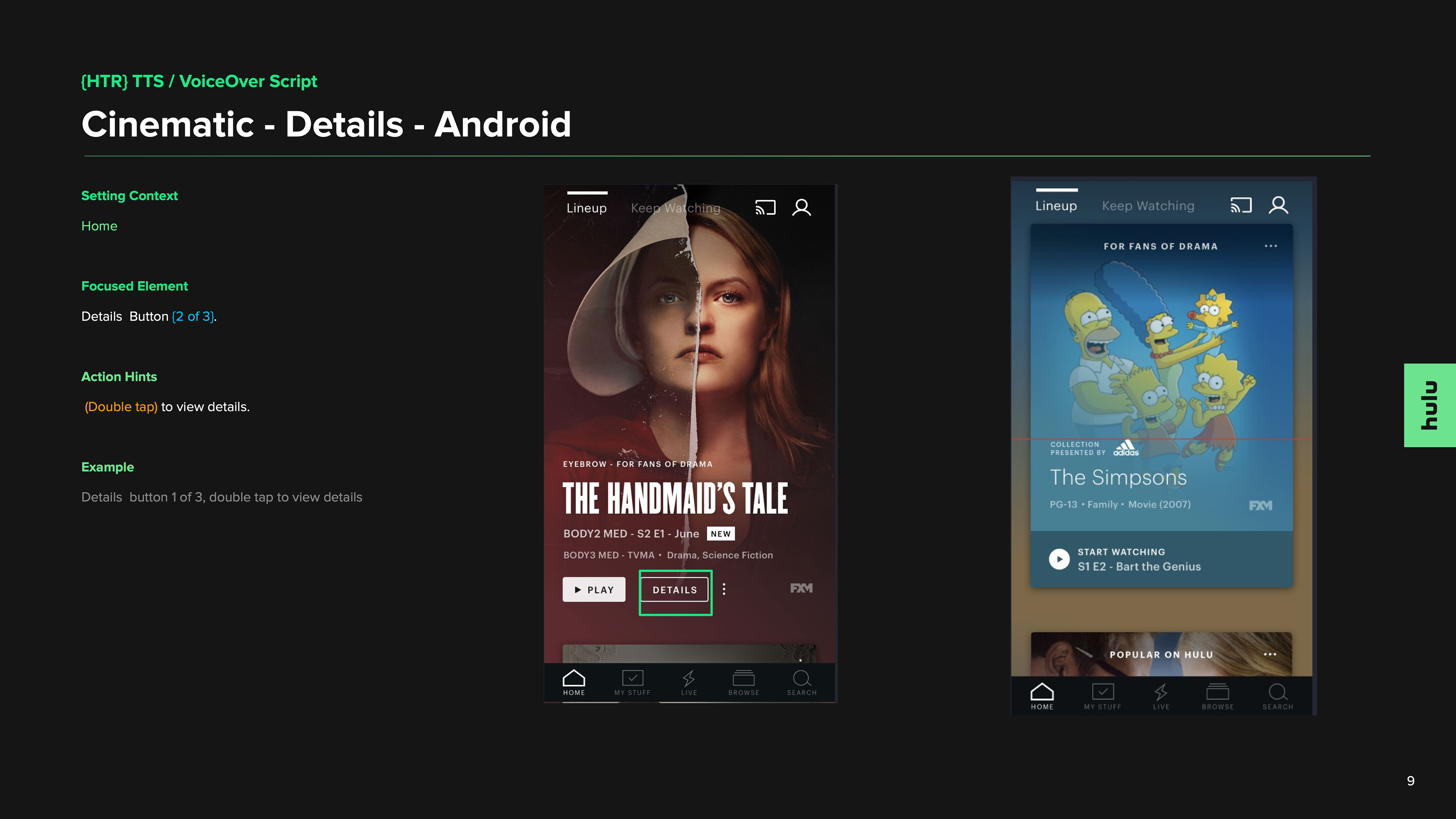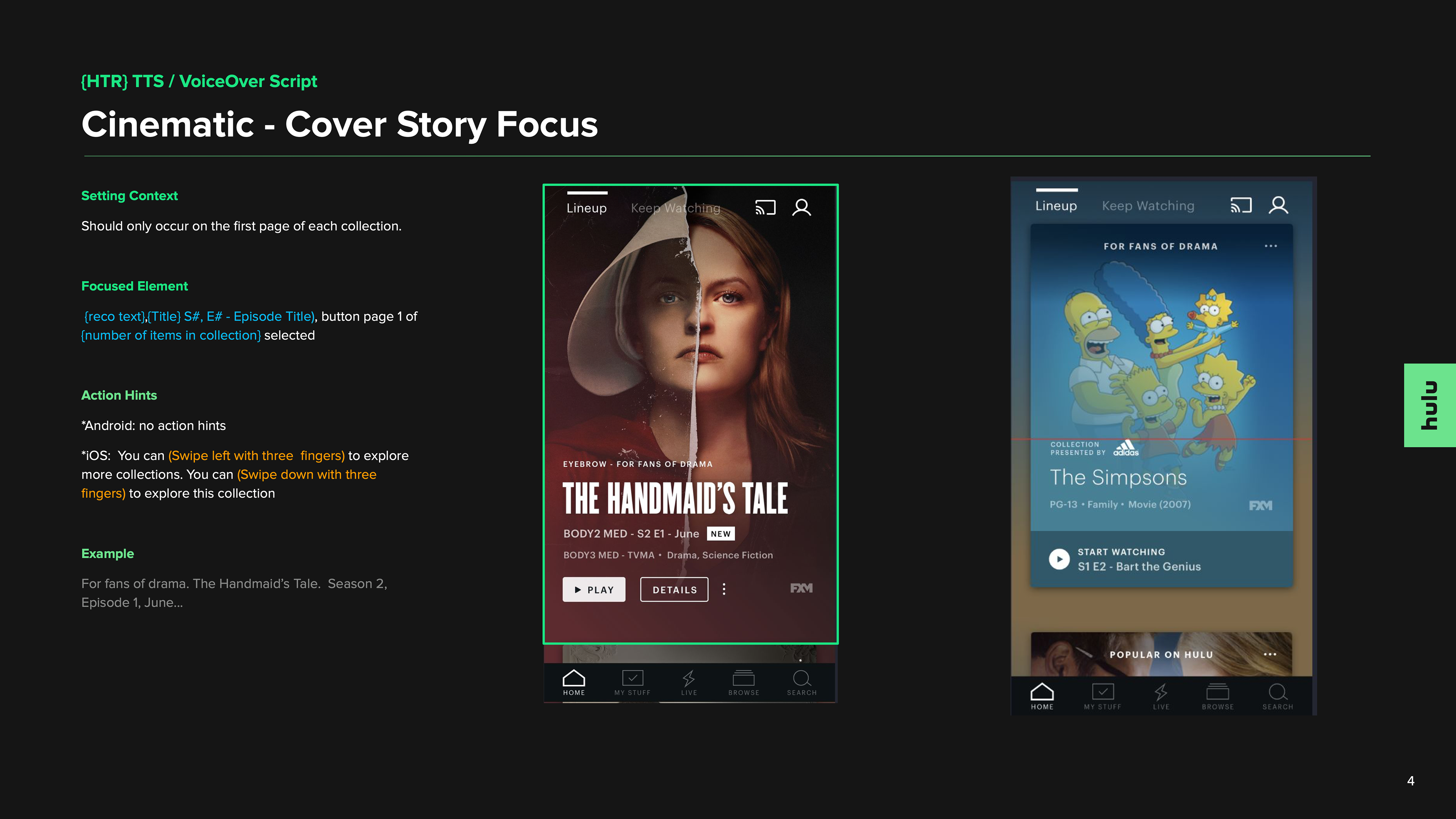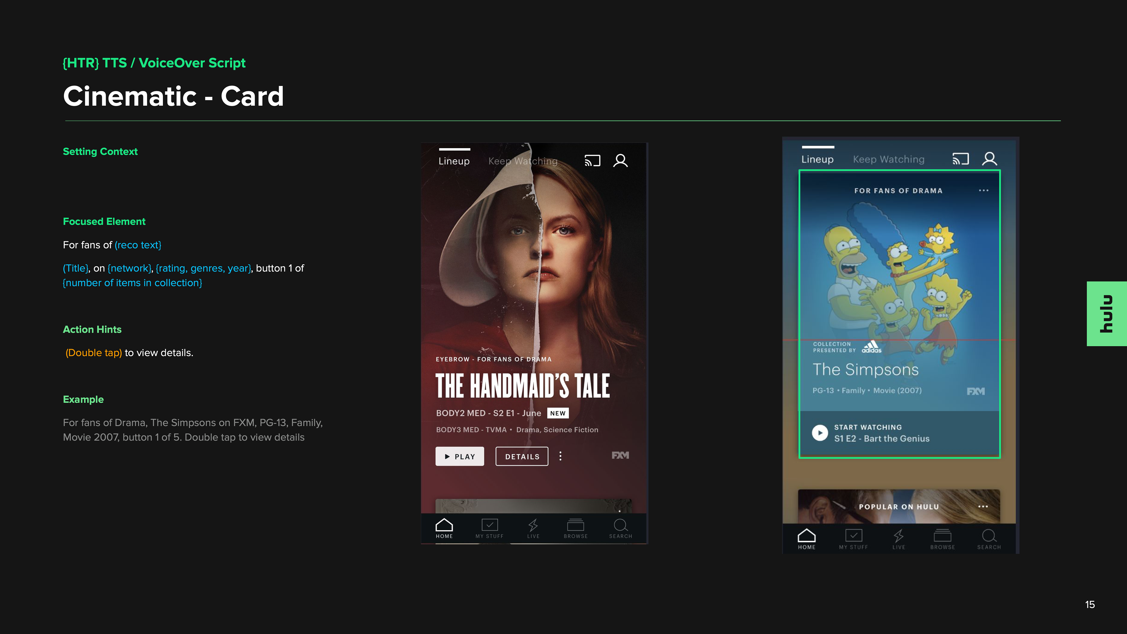 This work was completed in collaboration with the mobile development team. The focus was to create an experience tailored to users who use screen readers to navigate the Hulu app.