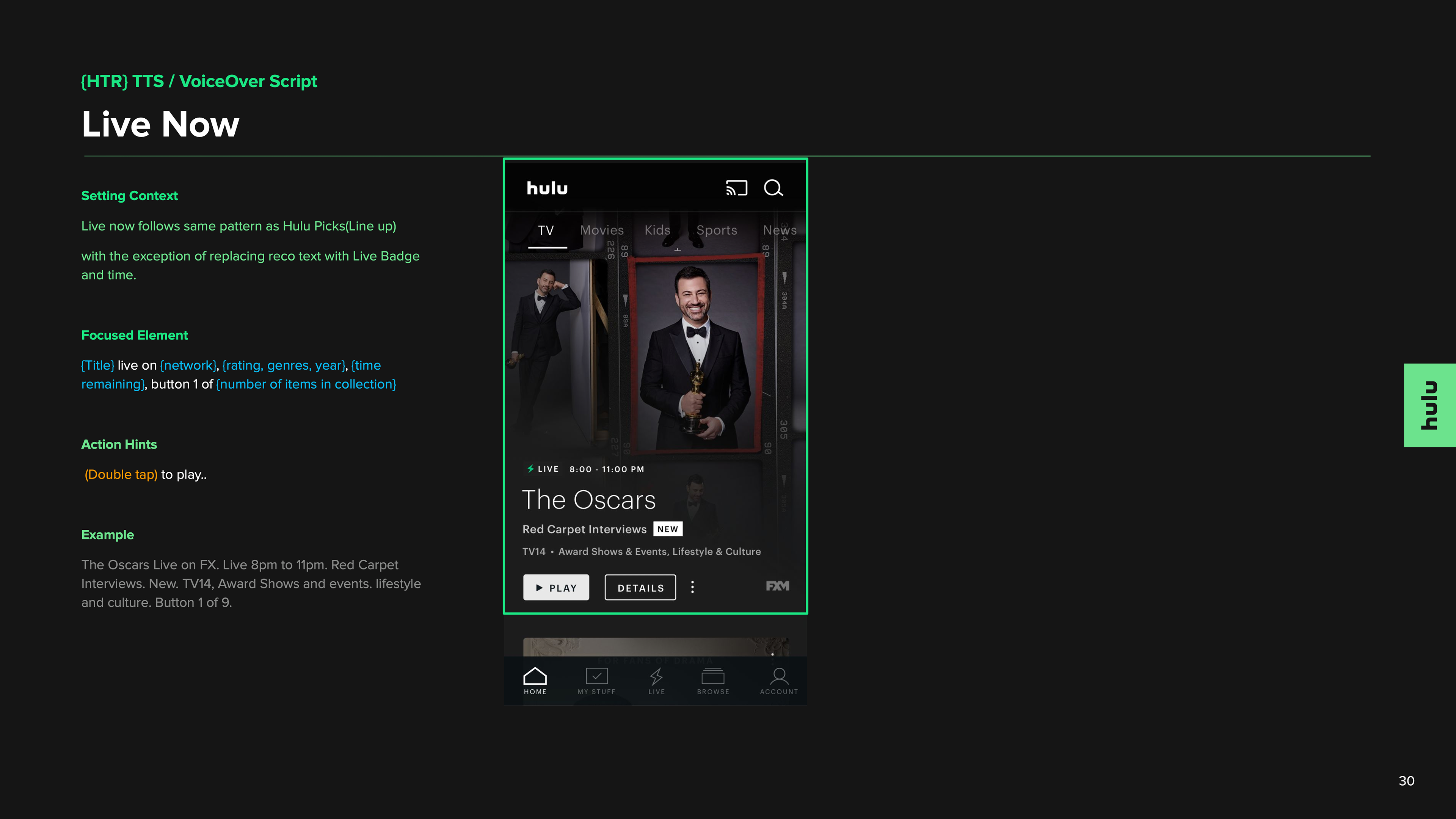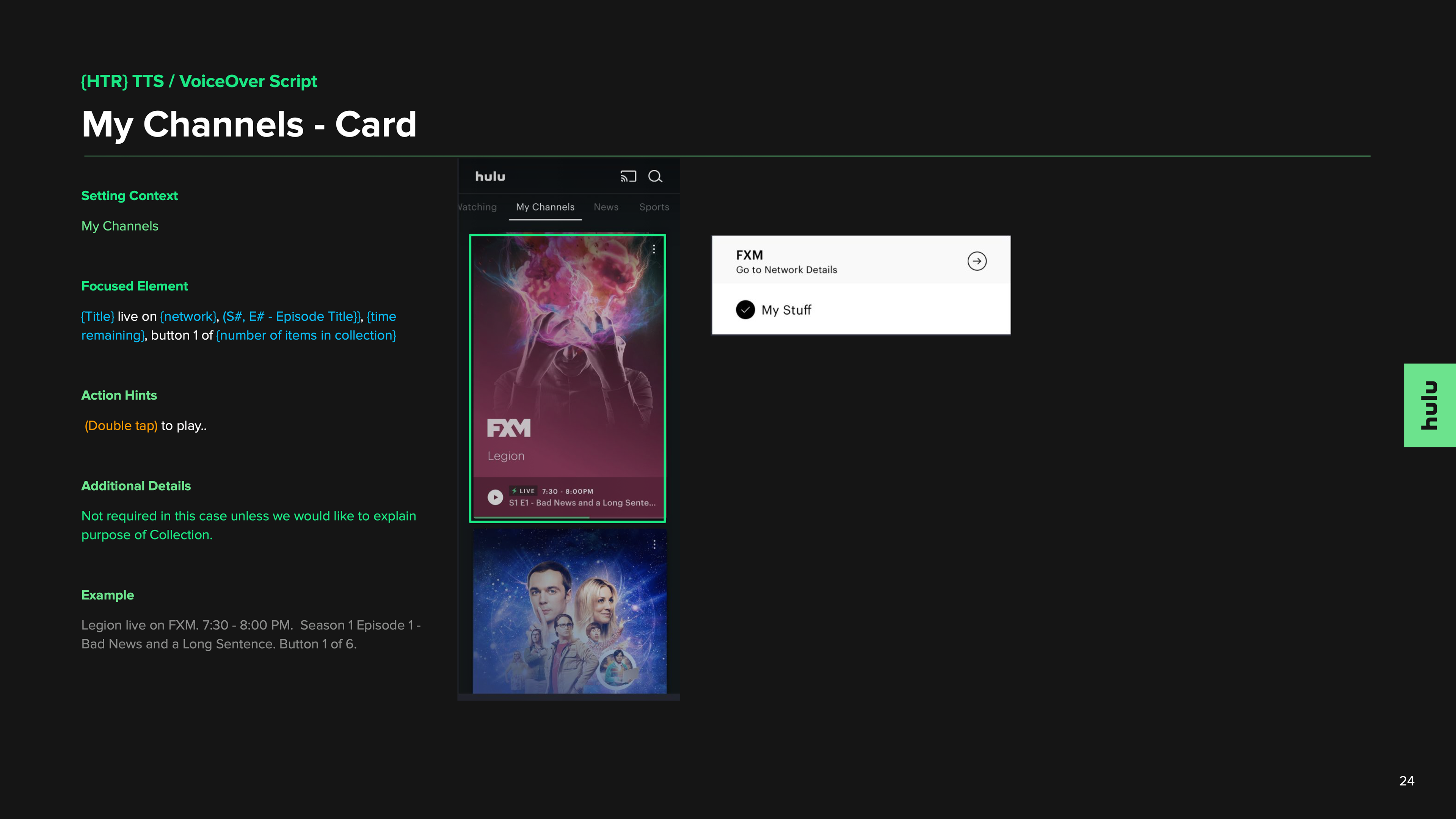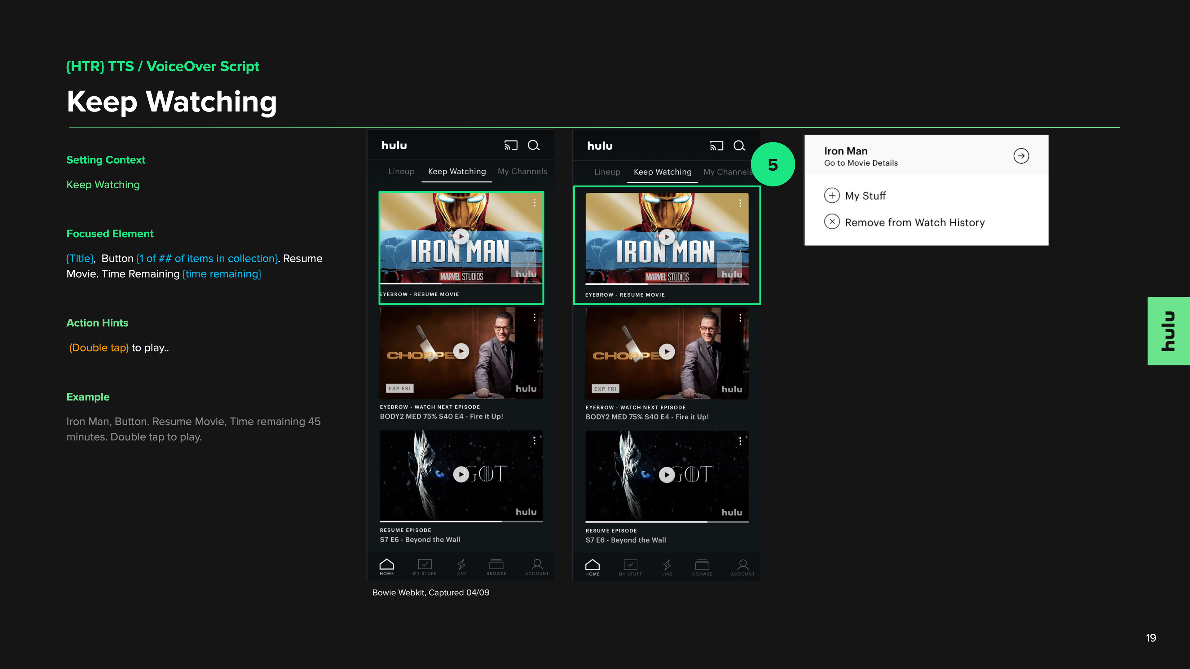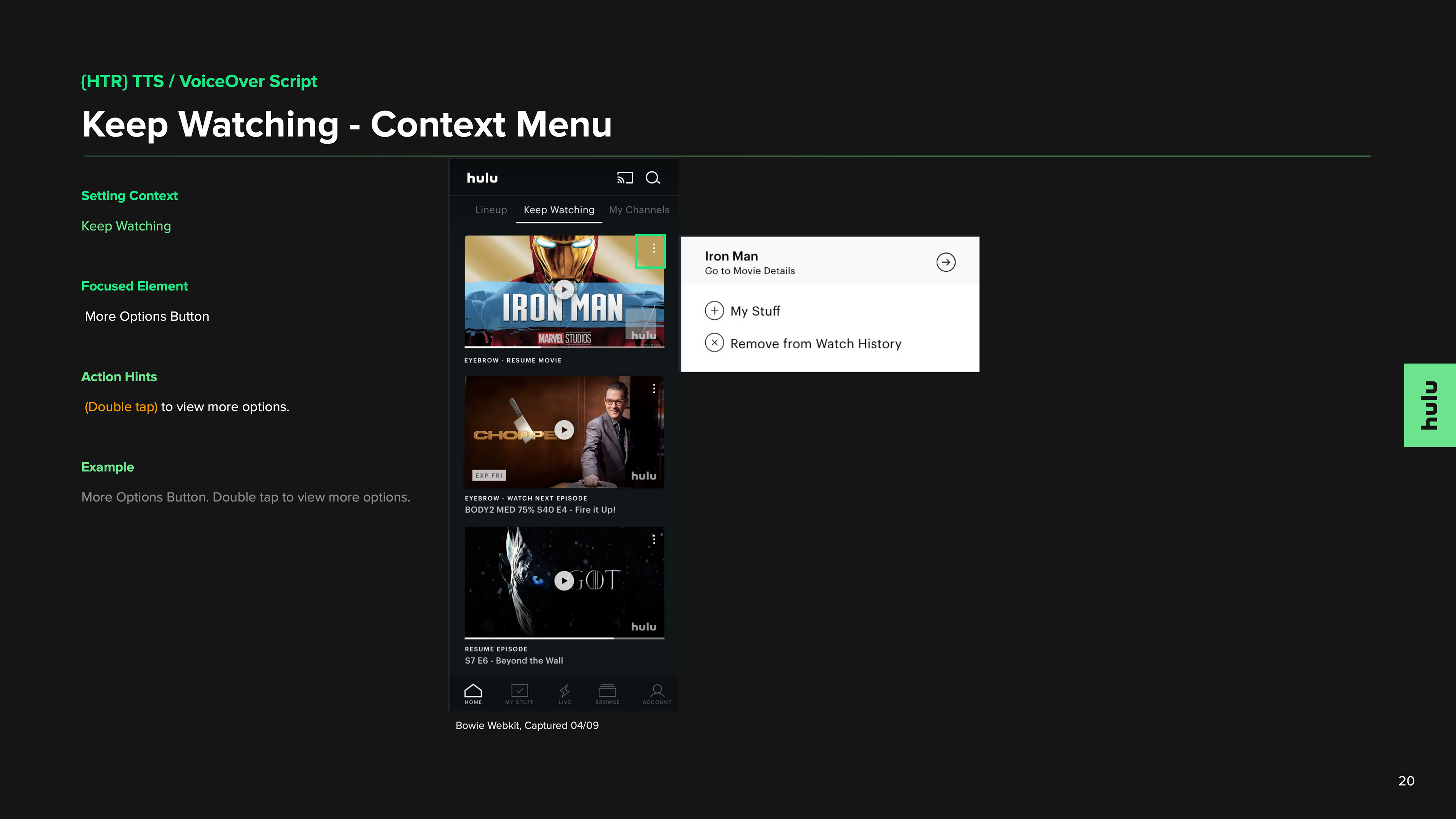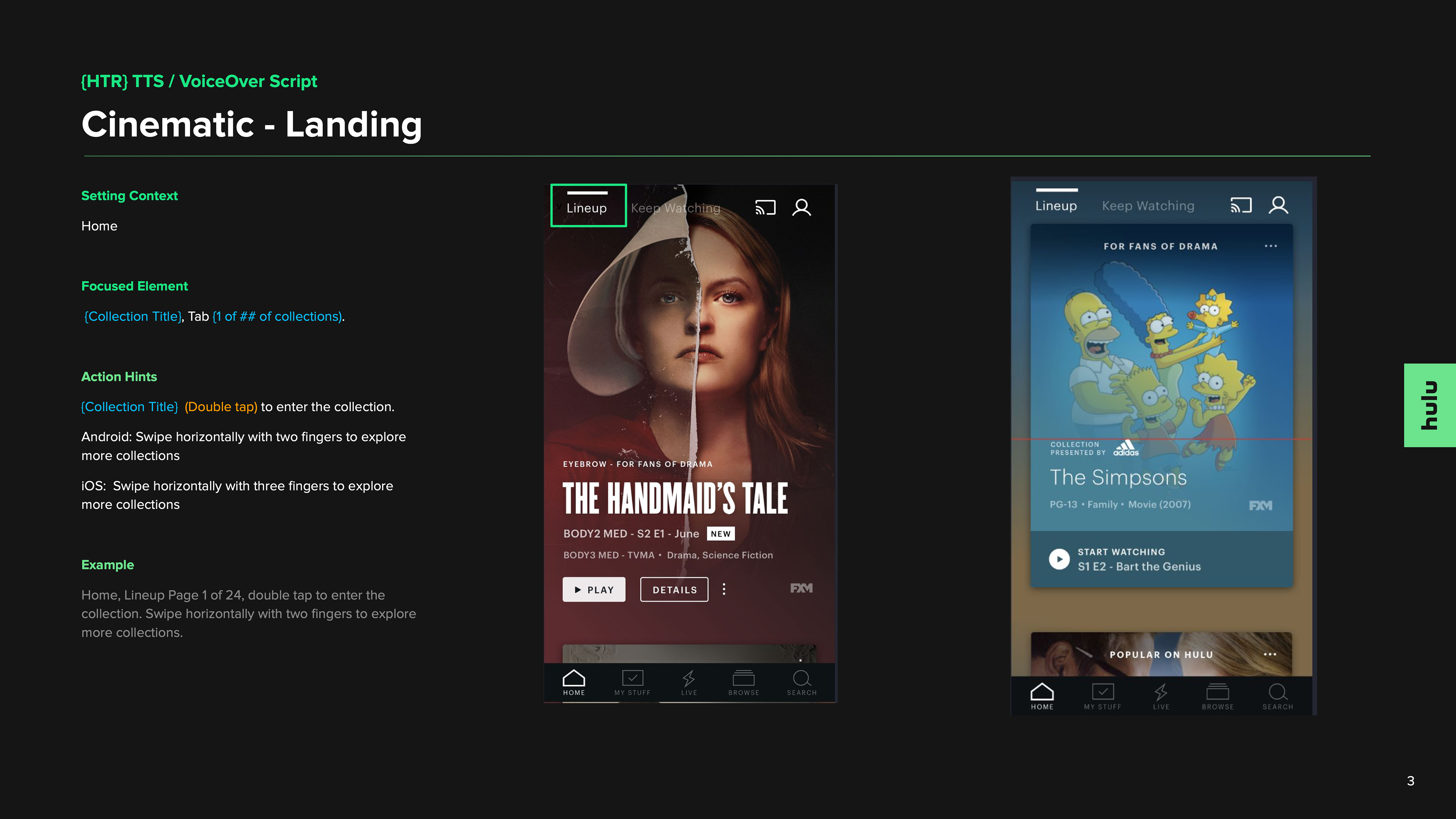 This work was completed in collaboration with the mobile development team. The focus was to create an experience tailored to users who use screen readers to navigate the Hulu app.