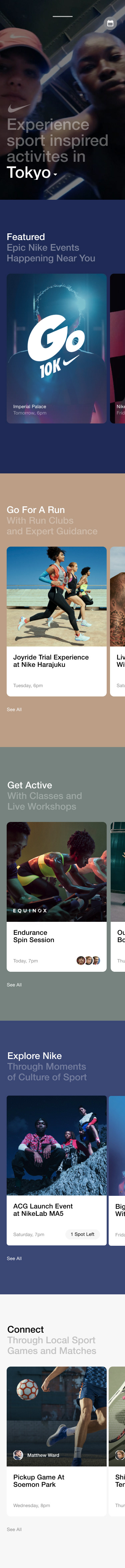 Below we get a detailed view of an event Page and glimpses of the Registration process to prepare users for their events. Partner pages and their respective brands blend Brand identities to create a bespoke experience while still aligning with the voice of the Nike experience. We also get a view of trainer profiles so that users can feel like they are getting the best of the best.